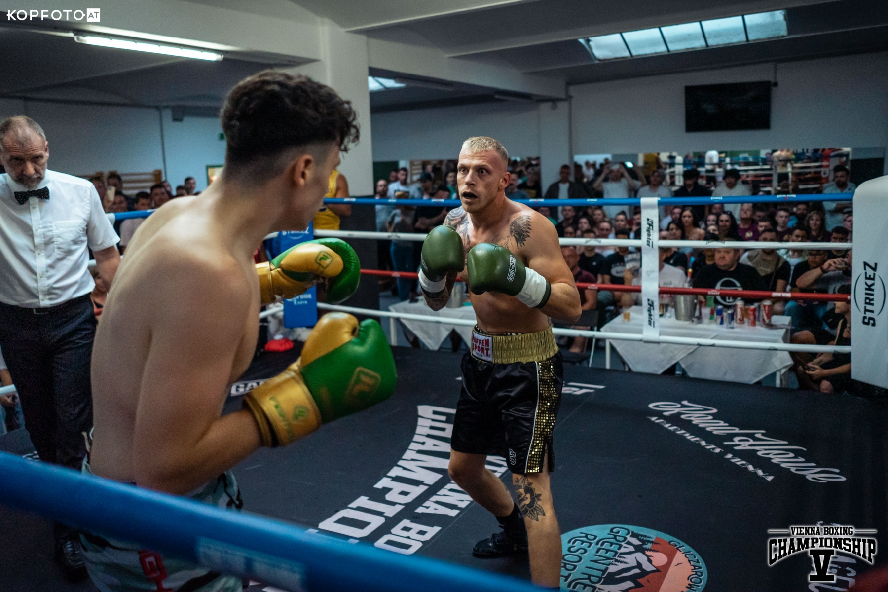 Weiter ging es mit Lokalmatador Rafael Anderle. Sein Kontrahent Mirko Jovanovic legte los wie die Feuerwehr und hämmerte mit 1 -2 und 1 -4 Kombos auf Anderle ein. Rafael zeigte sich jedoch nochmals stark verbessert und parierte die wilden Angriffe souverän. Mit krachende Kontern konnte er schon in Runde 1 Jovanovic viermal zu Boden bringen. Starker Auftritt von dem sympathischen Wiener der jetzt bei 4-0 hält.