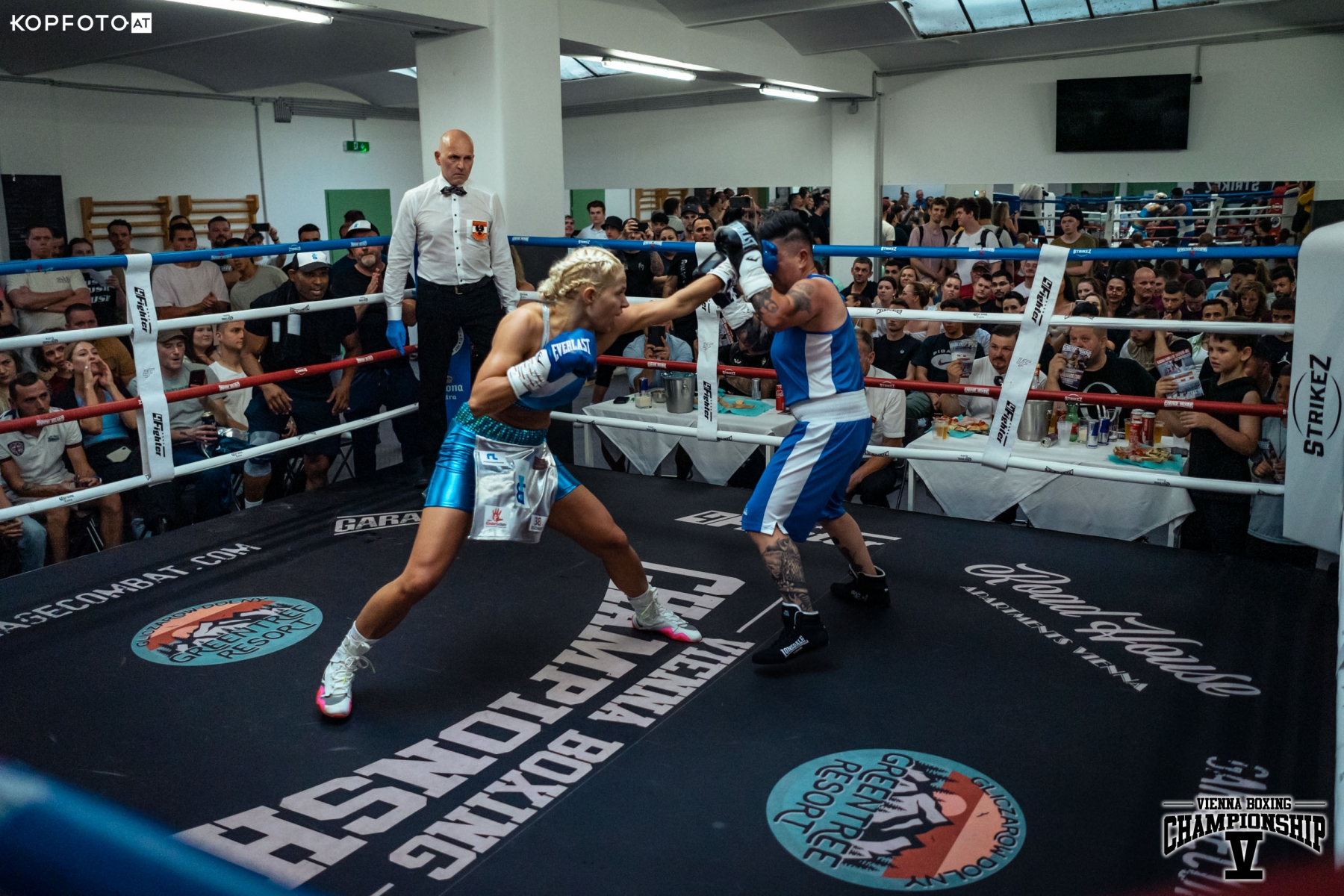 Bei den Pros startete dann Christine Pöppelmayer aus der Boxschmiede Wien gegen Nikolett Szabo. Klare Angelegenheit für die Deutsche, sie gewinnt durch TKO. Im zweiten Frauenkampf des Abends siegt die wunderbare Melina Maibaum. Sie überzeugte durch klasse Übersicht und einen technisch einwandfreien Stil. Sie ließ der Ungarin Andrea Jenei nicht den Hauch einer Chance. Das deutsche Schwergewicht und ehemaliger Bayernmeister der Amateure Tom Manzau, stoppt Filip Dacevac brutal in Runde 2. Tom wird bei der nächsten Championship im September ebenfalls wieder am Start sein.