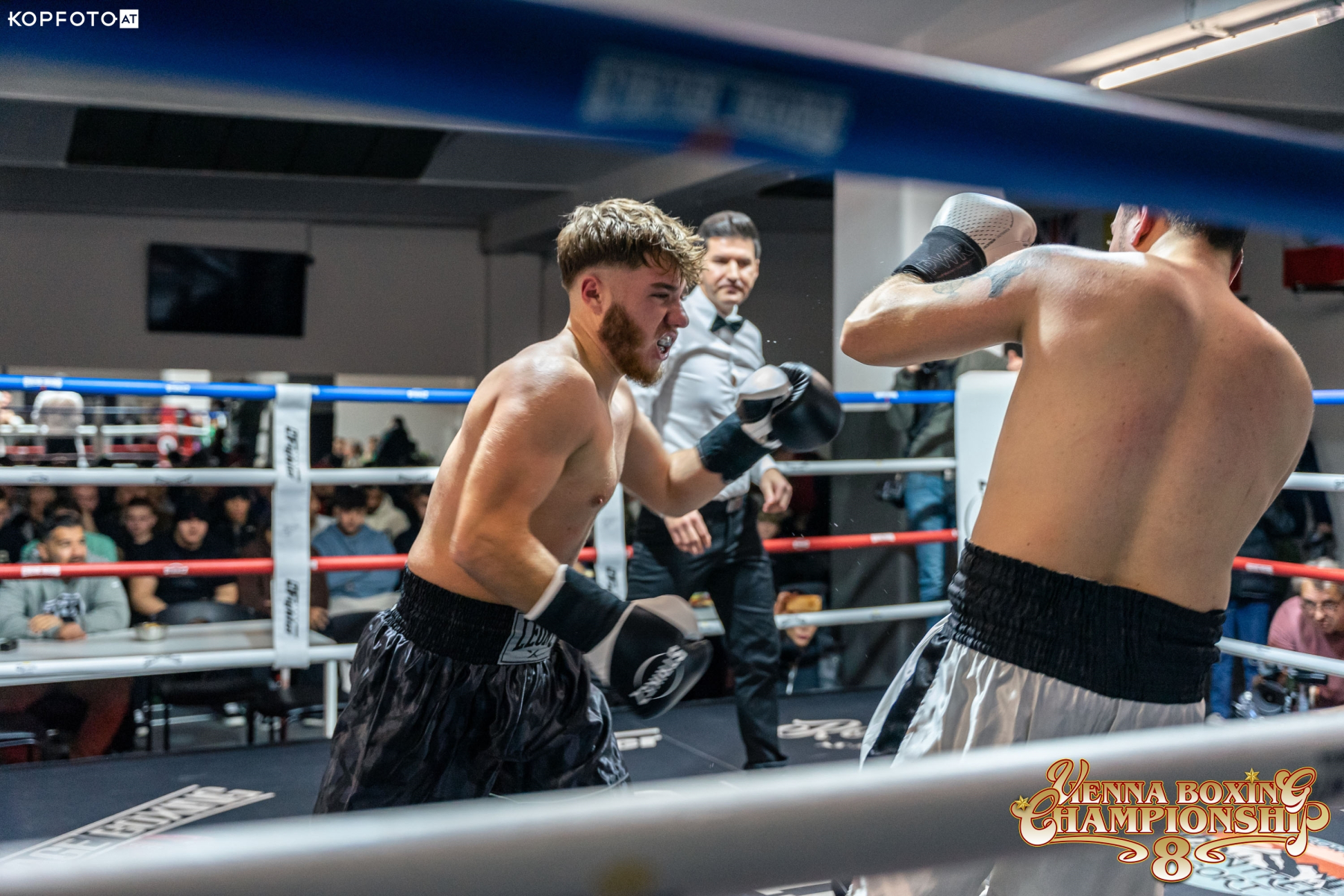 Danach waren die Pros dran. Den Anfang machte „die deutsche Axt“ Max Exeler. Kurzer Prozess mit Nikola Ugarkovic. Exeler, der aus Deutschland stammt, gab sein fulminantes Debut. Danach war Philip Köhler dran. Im Oktober diesen Jahres debutierte er als Österreichs jüngster Profi. Er schaltet Miroslav Dubeva aus.